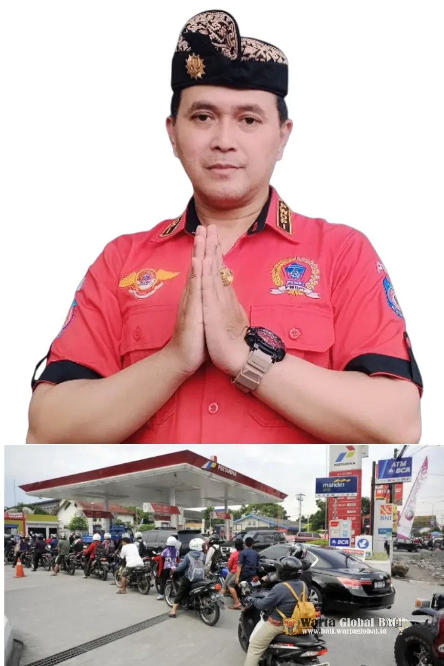 Foto : Ketua DPW PWDPI Provinsi Bali, Maichel Benedictus (Romo Benny), (bawah) antrian SPBU yang mengular dan menyebabkan kemacetan lalulintas