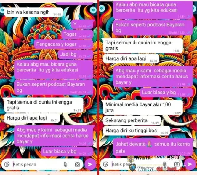 Tim redaksi WartaGlobalBali.Id awalnya berniat baik. Kami ingin mengonfirmasi sekaligus memberi ruang klarifikasi kepada Made Hiroki, nama yang tengah panas menjadi buah bibir publik pasca polemik dengan Ni Luh Djelantik. Alih-alih mendapat penjelasan jernih, kami malah dihadapkan pada negosiasi ala pasar tradisional—tapi dengan nominal selangit.
