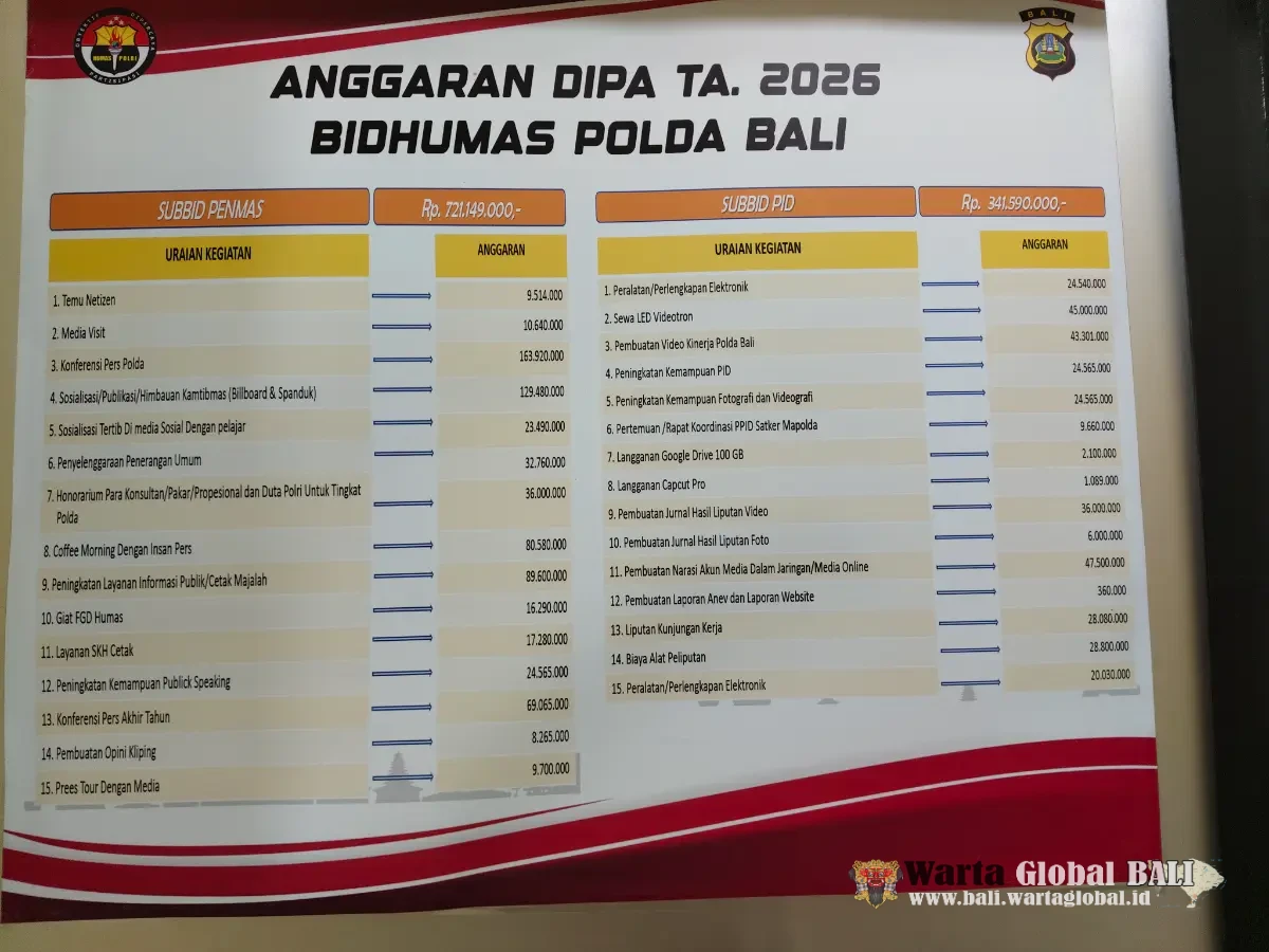 Polda Bali melalui Bidang Humas (Bidhumas) mengalokasikan anggaran DIPA Tahun Anggaran (TA) 2026 sebesar total Rp 2,09 miliar untuk mendukung operasional humas, penanganan opini publik, dan sosialisasi kamtibmas. Rinciannya mencakup Subbag Renmin Rp 606.177.000, Subbid Mulmed Rp 421.676.000, Subbid Penmas Rp 721.149.000, dan Subbid Pid Rp 341.590.000.